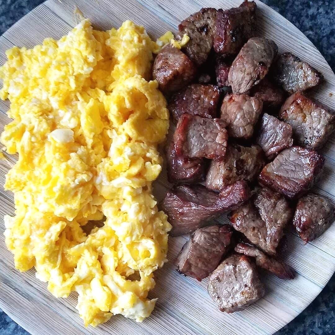 Your classic bodybuilders breakfast of two scrambled eggs and 4oz of chopped steak.