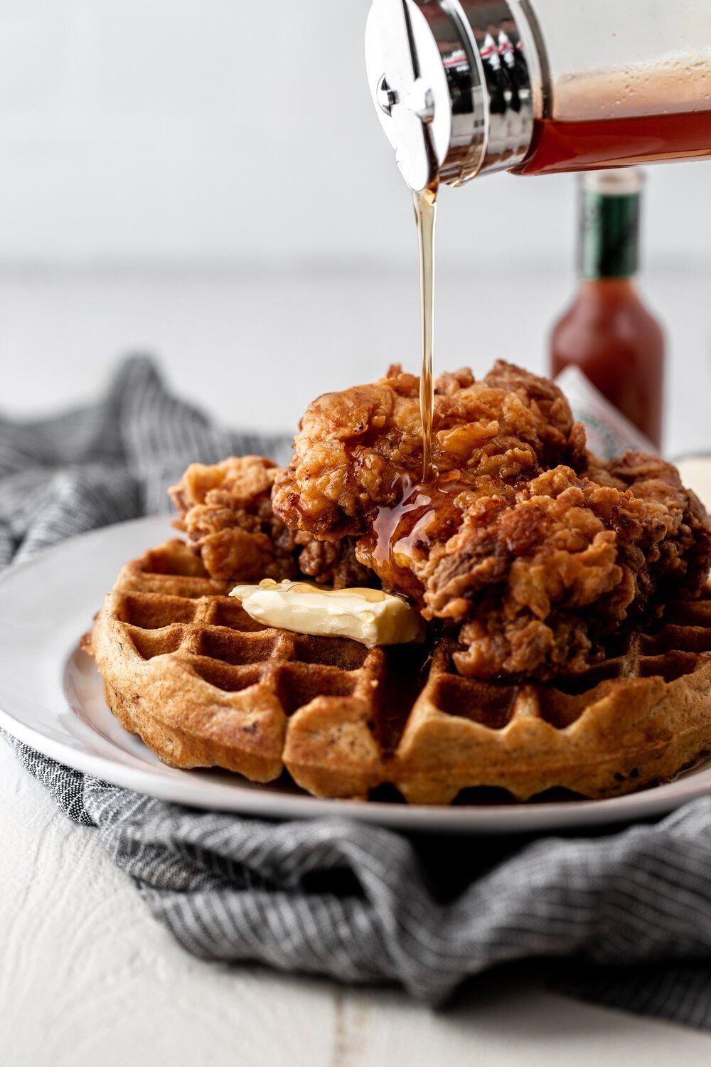 One fluffy Belgium waffle with two crispy chicken tenders served maple syrup. (Hot sauce on request)